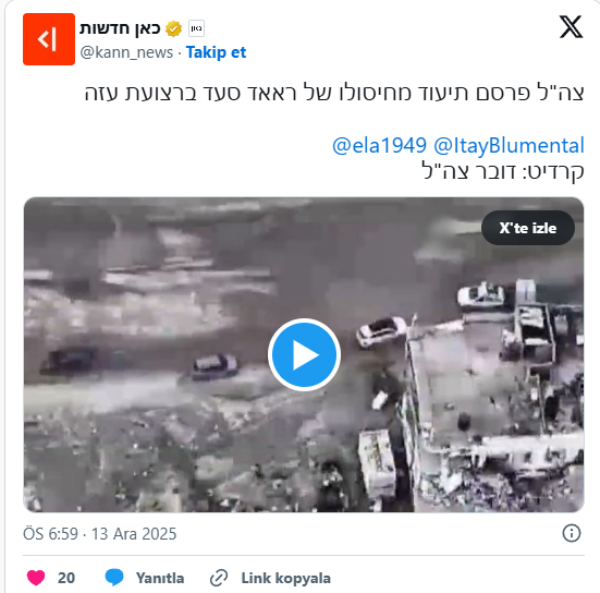 İsrail Savunma Kuvvetleri (IDF) tarafından yapılan açıklamada, saldırının video kaydı yayınlanarak, Hamas'ın silahlı kanadı Kassam Tugayları'nın üst düzey komutanlarından Raad Saad'ın öldürüldüğü kaydedildi.