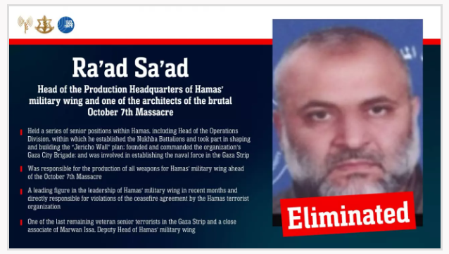 "Raad Saad... Hamas'ın askeri kanadının Üretim Karargahı Başkanı ve 7 Ekim Katliamı'nın acımasız mimarlarından biri.