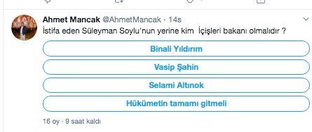Gelecek Partisi Genel Başkanı Ahmet Davutoğlu’na yakınlığıyla bilinen Ahmet Mancak, Soylu’nun istifa etmesi ve bu kararın Cumhurbaşkanı Recep Tayyip Erdoğan tarafından kabul edilmemesi arasında geçen kısa süre zarfında bile Soylu’nun yerine kimin geçmesi gerektiği konusunda Twitter’dan anket yaptı.