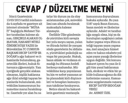 Sözcü gazetesi, Cumhurbaşkanı Recep Tayyip Erdoğan ve ailesi hakkında yayınladığı asılsız, hakaret dolu haberleri için sürekli tekzip yayınlamak zorunda kalıyor. Bugün yine bir tekzip yayınlayan Sözcü gaztesi’nin “gazetecilik ilkeleri gereği yayın yapmadığı” bir kez daha yargı tarafından tasdiklendi.
