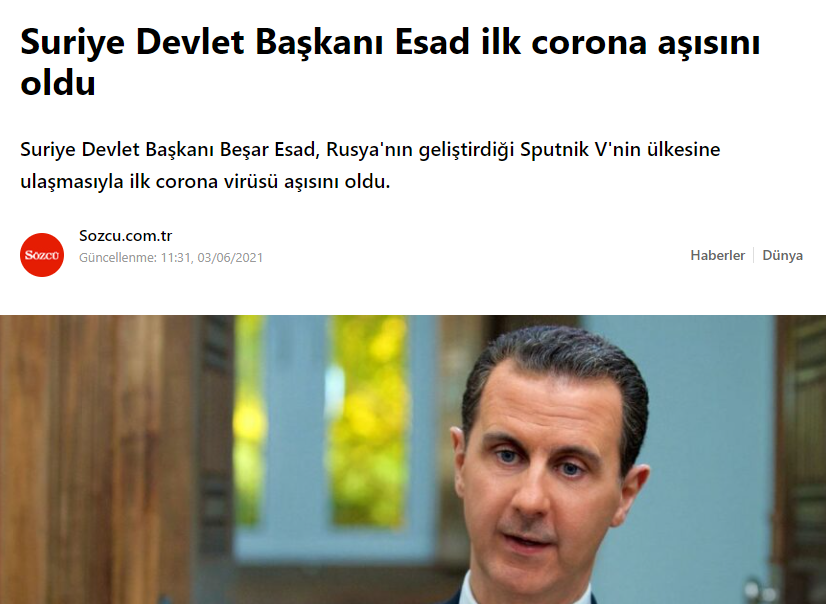 Sözcü Gazetesi, çocuk katili Esad'ın koronavirüs aşısı olduğunu haberleştirdi. Haberde, Esad'ın koronavirüs rahatsızlığı geçirdiği hatırlatılırken, aşı olduğu bilgisi verildi. Suriye'deki seçim sonuçlarının da aktarıldığı metinde, Esad, şu ifadelerle güzellendi: "55 yaşındaki Esad, mayıs ayının sonunda yapılan seçimlerde batılı ülkelerin hileli olarak nitelediği sonuçlara rağmen yüzde 95 oy alarak dördüncü kez sandıktan zaferle çıktı."