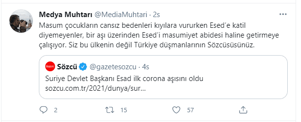 "Masum çocukların cansız bedenleri kıyılara vururken Esed’e katil diyemeyenler, bir aşı üzerinden Esed’i masumiyet abidesi haline getirmeye çalışıyor. Siz bu ülkenin değil Türkiye düşmanlarının Sözcüsüsünüz."