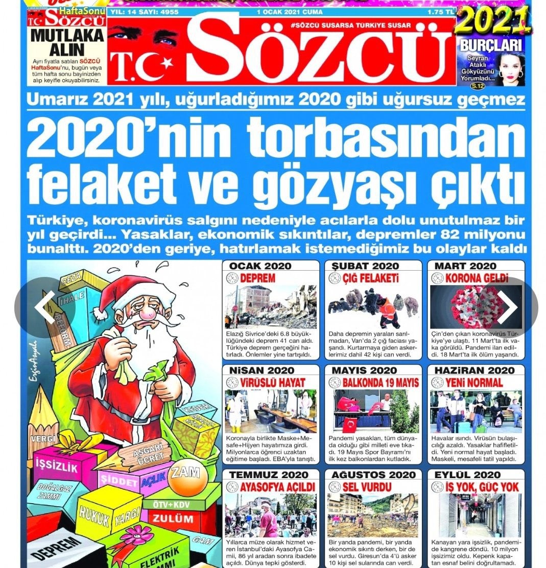 Sözcü gazetesinin "2020'nin torbasından felaket ve gözyaşı çıktı" manşetinde Ayasofya-i Kebir Camii açılışına ilişkin ifademer üzerine açılan davada gazetenin sorumlu müdürü ve sorumlu müdürün bağlı olduğu yetkiliye 7 ay 15'er gün hapis cezası verildi.