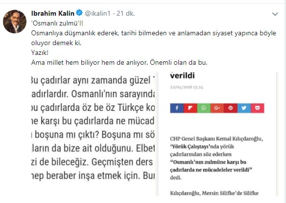 Sosyal medya hesabından paylaşım yapan Sözcü İbrahim Kalın, “Osmanlı zulmü!!’ Osmanlı’ya düşmanlık ederek, tarihi bilmeden ve anlamadan siyaset yapınca böyle oluyor demek ki. Ama millet hem biliyor hem de anlıyor. Önemli olan da bu” ifadeleriyle birlikte CHP lideri Kılıçdaroğlu’nun Yörük Çalıştayı’nda yaptığı konuşmanın metnini paylaştı.