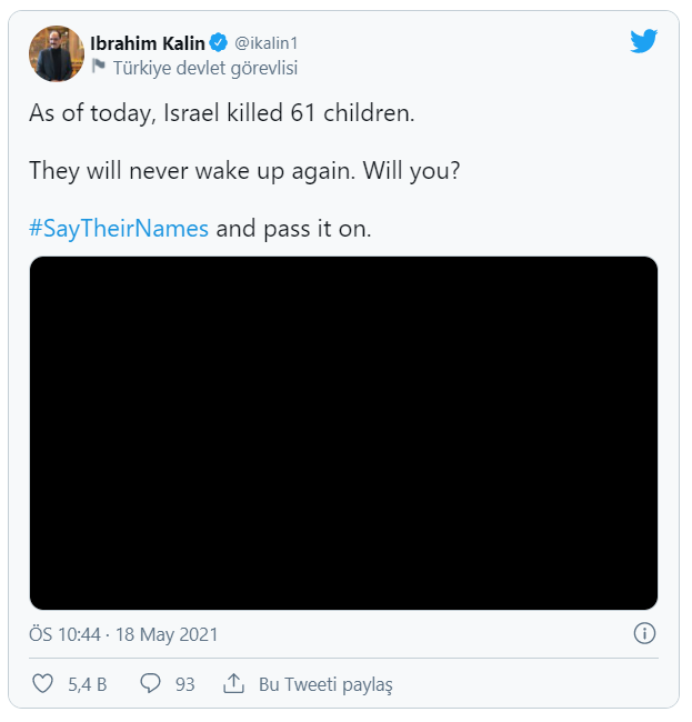 Cumhurbaşkanlığı Sözcüsü İbrahim Kalın, İsrail'in Gazze'ye yönelik saldırılarında şehit çocukların isimlerini sosyal medyadan duyurma çağrısı yaptı.
