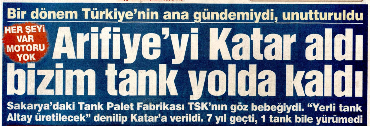 CHP'nin arka bahçesi haline gelen Sözcü, bugünkü manşetinde, "Arifiye'yi Katar aldı bizim tank yolda kaldı" ifadesini kullandı. CHP'lilerin sürekli söylediği "Her şeyi var motoru yok" yalanını papağan gibi tekrarlayan gazete, "Sakarya'daki Tank Palet Fabrikası TSK'nın göz bebeğiydi. Yerli tank Altay üretilecek denilip Katar'a verildi. 7 yıl geçti, 1 tank bile yürümedi" spotuyla algı operasyonuna girişti.