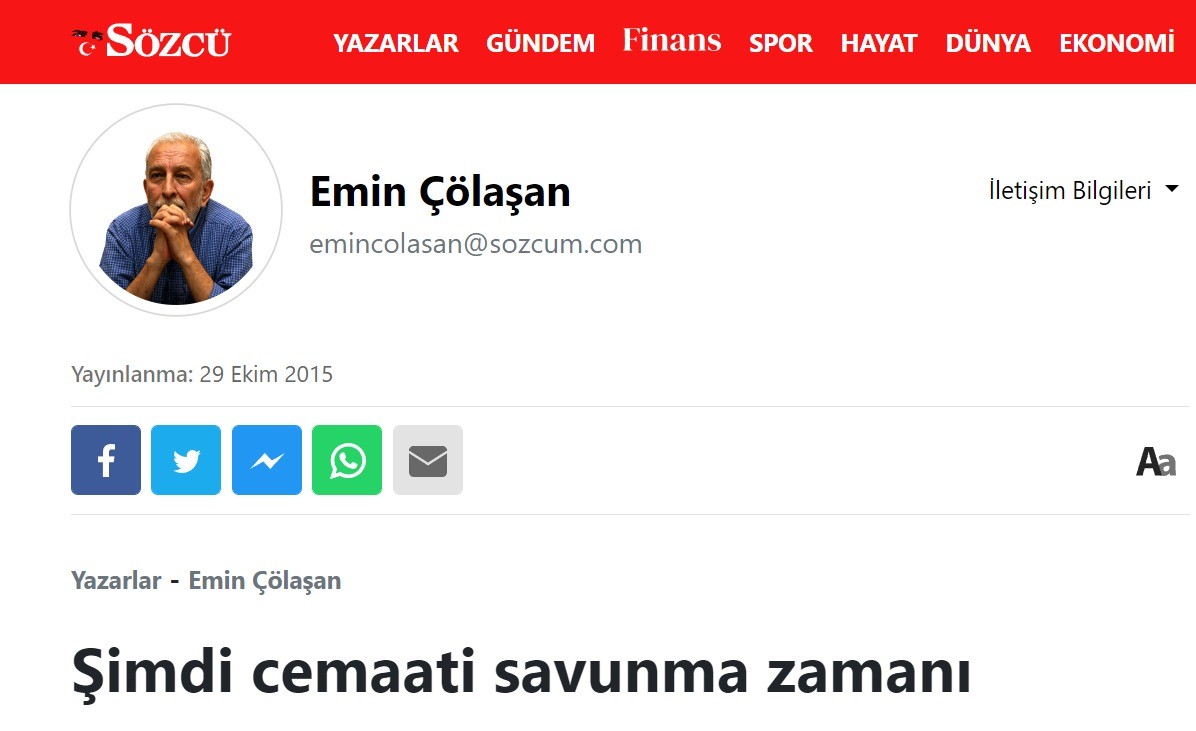 Sözcü'de kalem sallayan Emin Çölaşan, 29 Ekim 2015'te yazdığı 'Şimdi cemaati savunma zamanı' başlıklı yazısında Türkiye Cumhuriyeti'nde darbe yaparak devleti ortadan kaldırmak isteyen FETÖ'yü can siperhane şekilde savundu. Fetullahçı Terör Örgütü'ne methiyeler düzen Çölaşan, diğer bir Türkiye'nin baş belası olan terör örgütü PKK'nın siyasi ayağı HDP'ye de oy istedi. Şimdi buradan soruyoruz 'Atatürkçü çizgiden milim ayrılmayan' Sözcü'ye 'Atatürk'ün ilkelerinde HDP'ye oy istemek var mı?'