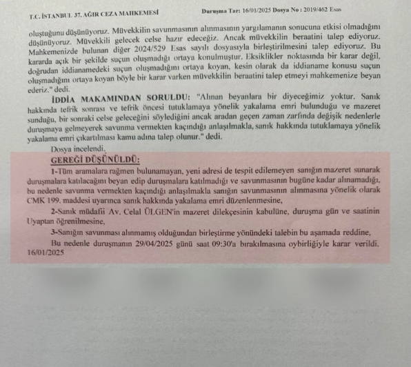 İstanbul 37. Ağır Ceza Mahkemesi'nin, beyanların ardından verdiği kararında "Tüm aramalara rağmen bulunamayan, yeni adresi de tespit edilemeyen sanığın, mazeret sunarak duruşmalara katılacağını beyan edip duruşmalara katılmadığı ve savunmasının bugüne kadar alınamadığı, bu nedenle savunma vermekten kaçındığı anlaşılmakla sanığın savunmasının alınmasına yönelik olarak CMK 199. maddesi uyarınca sanık hakkında yakalama emri düzenlenmesine oy birliği ile karar verildi" denildi.