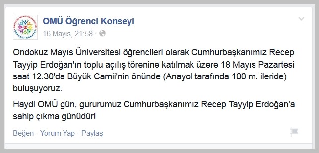 YENİAKİT.COM.TR - Ondokuz Mayıs Üniversitesi'nin çalışmaları ile adından sıkça söz ettiren "Öğrenci Konseyi"nin Resmî Facebook hesabı üzerinden Cumhuriyet tarihinin ilk seçilmiş Cumhurbaşkanı olan Recep Tayyip Erdoğan'ın toplu açılış törenine katılım duyurusu yayınlandı. Devlet reisi Erdoğan'ın Samsun'a geleceğini geçtiğimiz haftadan duyurmaya başlayan sayfanın bu tavrı, terör örgütü DHKP-C'ye yakın Sol ile laik yobazlığın Sözcü'sünü rahatsız etti.