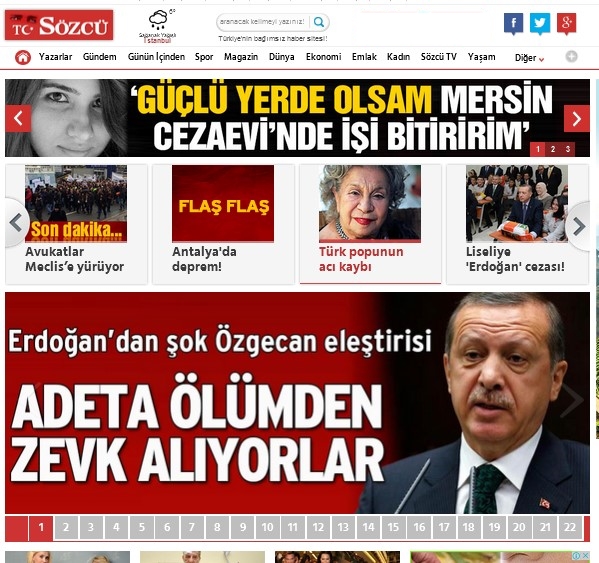 "Erdoğan’dan şok Özgecan eleştirisi" başlıklı haberiyle Laik Yobazlığın Sözcü'sü, Erdoğan'ın CHP'li Aylin Nazlıaka'nın da aralarında bulunduğu 'danslı protesto'yı eleştirmesini çarpıttı ve Erdoğan'ın "protestolara tamamen karşı çıkıyormuş" izlenimi vererek büyük bir skandala imza attı. Manşettinde ise "Adeta ölümlerden zevk alıyorlar" diye geçmesi Erdoğan'ın 'ölümlerden zevk aldığı' algısı oluşturmaya çalıştı.