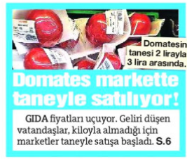 Akit TV’de yayınlanan Manşetlerin Dili programında konuyu değerlendiren Akit Gazetesi Yazı İşleri Müdürü Ali İhsan Karahasanoğlu, “Domatesin fiyatı 2 yıl öncesine kadar 12 liraya kadar çıkmıştı. Şimdi 5-6 lira seviyesinde, 4 liraya kadar var ama gelin görün ki şimdi tek domatesle ambalaj yapıyorlar. Ambalajının fiyatı ne kadar diye sorarsanız belki 1 liraya da o ambalaj mal olacaktır. Şimdi bu Türkiye’deki iyileşmenin göstergesi mi, özel domatesleri bile marketlerde bulabilme, belli bir kesime hitap eden bir domatesin varlığı mı acaba Türkiye’nin geliştiğini gösteriyor. Yoksa bu tarafın yaptığı algı operasyonundaki gibi aslında ucuz domatesler ama yarım kilo 1 kilo alamıyor da vatandaş gidiyor tek tek tane ile alıyormuş gibi yapılan bir algıyla karşı karşıya kalıyoruz.” dedi.