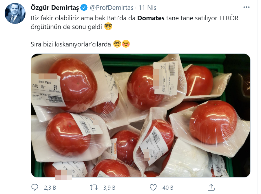 Bu ülken her türlü nimetinden yararlanıp, açlık edebiyatı yaparak ekonomi krizi çığırtkanlığı yapan Sözcü, şimdi de özel olarak satılan bir domates türü üzerinden algı operasyonuna imza attı. Tek tek satılan domates türünün fotoğrafını gösterip, "Domates markette taneyle satılıyor” başlığı atarak açlık çığırtkanlığı yapan Sözcü’ye bir destek de Özgür Demirtaş’tan geldi. Demirtaş, “Biz fakir olabiliriz ama bak Batı’da da domates tane tane satılıyor. Terör örgütünün de sonu geldi. Sıra bizi kıskanıyolar’cılarda” ifadelerini kullanarak Sözcü’nün algı operasyonunu laubaliliğe çevirdi.