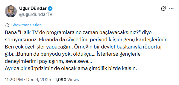 Sözcü’den kovulduktan sonra Halk TV’de işe başladığı iddia edilen Uğur Dündar sosyal medya platformu X’ten yaptığı açıklamada iddialı konuştu. Dündar “Bana ‘Halk TV'de programlara ne zaman başlayacaksınız?’ diye soruyorsunuz. Ekranda da söyledim; periyodik işler genç kardeşlerimin. Ben çok özel işler yapacağım. Örneğin bir devlet başkanıyla röportaj gibi... Bunun da periyodu yok, oldukça... İsterlerse gençlerle deneyimlerimi paylaşırım, seve seve... Ayrıca bir sürprizimiz de olacak ama şimdilik bizde kalsın” dedi.