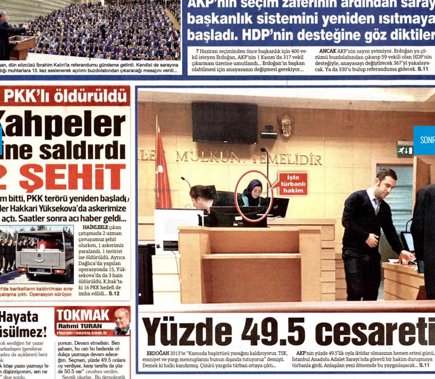 Bir süredir Paralel Yapı'nın sözcülüğünü üstlenen ve İslami değerleri ayaklar altına alan haberleriyle gündeme gelen Sözcü gazetesi, yine özgürlükleri hedef aldı. Müslüman bir ülkede, dini gerekleri nedeniyle başörtüsü takan kadın hakimi hazmedemeyen Sözcü gazetesi, bugün birinci sayfasında yayınladığı haberde "yüzde 49.5 cesareti" başlığını kullanarak büyük bir skandala imza attı. AK Parti'nin toplum üzerindeki baskıları kaldırıp, özgürlüklerden yana tavır takınmasını bir türlü kabullenemeyen Sözcü, başörtülü hakim üzerinden AK Parti'yi hedef alarak, klasik bir eski Türkiye argümanı olan 'laiklik elden gidiyor' yalanına sarıldı.