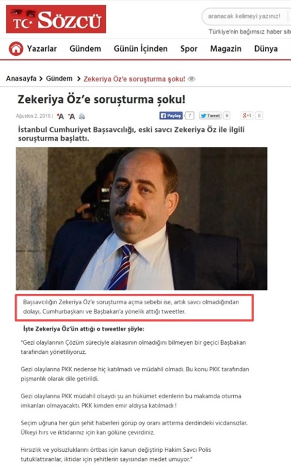 Sözcü ise, soruşturmanın nedenini "Başsavcılığın Zekeriya Öz’e soruşturma açma sebebi ise, artık savcı olmadığından dolayı, Cumhurbaşkanı ve Başbakan’a yönelik attığı tweetler" şeklinde açıklayarak büyük bir skandala imza attı.