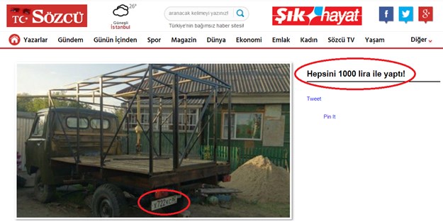 Yalan bülteni Sözcü, internet sitesinde yayınladığı foto haber ile bir yalana daha imza attı. Söz konusu foto haberde bir kamyonete yer veren Sözcü, habere ‘Hepsini 1000 lira ile yaptılar’ başlığını attı. Sözcü’nün yalanı aracın plakası ile ortaya çıktı. Yabancı plaka aracı Türkiye’deki araçmış gibi sunan Sözcü bir kez daha fena çuvallamış oldu.