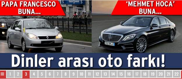 YENİAKİT.COM.TR - Sözcü gazetesi, Diyanet İşleri Başkanı Mehmet Görmez'in makam aracını eleştirmek isterken kendi patronunu görmezden geldi. Bugün, gazetenin internet sitesinde yayınlanan 'Dinler arası oto farkı' başlıklı bir haberde Mehmet Görmez ve Papa'nın makam araçları diye bir karşılaştırma yapan Sözcü, kend, patronu Burak Akbay, eşi ve annesinin bindiği ve vergilerini ödemediği iddia edilen AUDİ ve Mercedes markalı lüks otomobilleri akıllara getirdi.