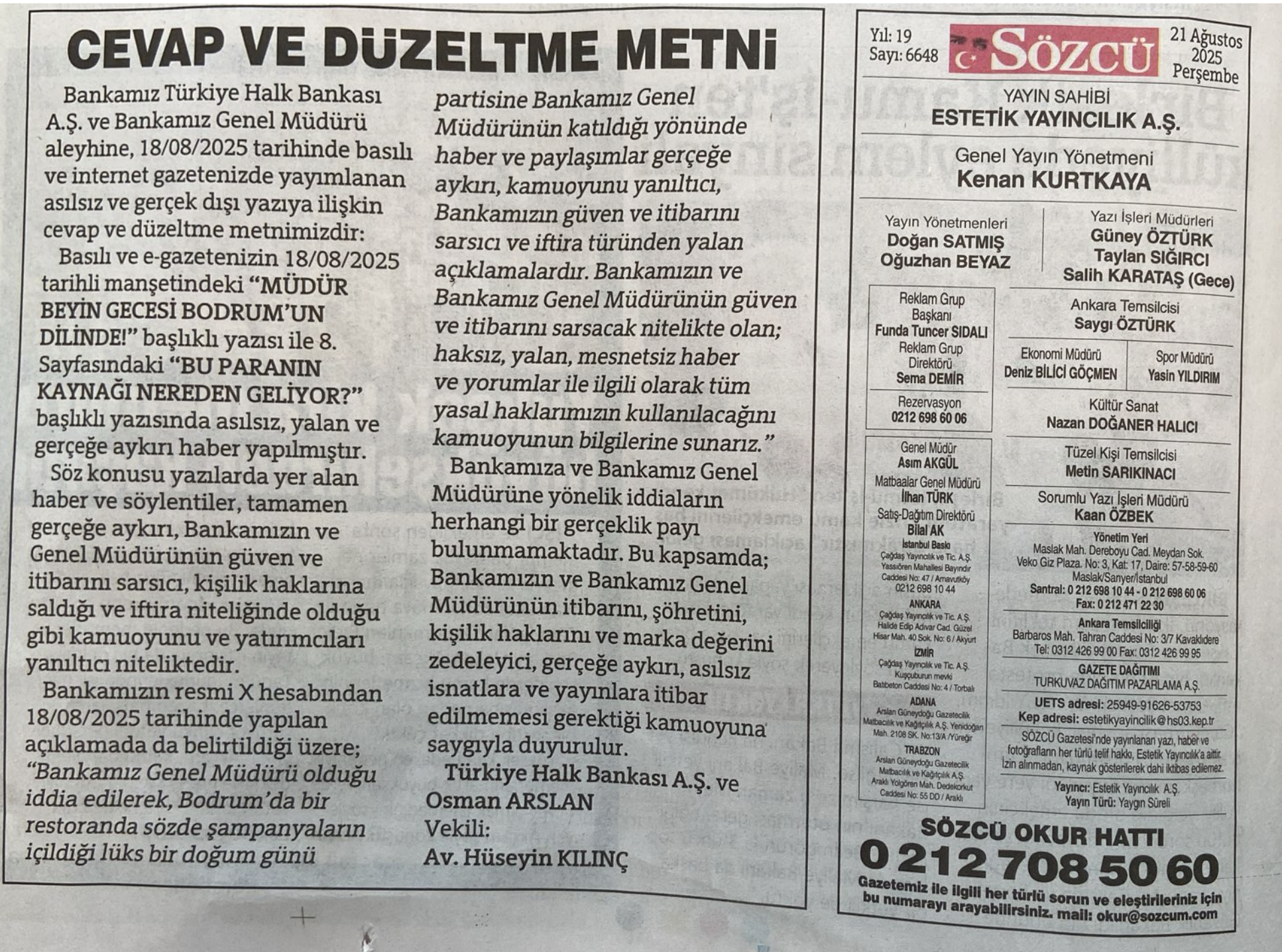 Bankamız Türkiye Halk Bankası A.Ş. ve Bankamız Genel Müdürü aleyhine, 18/08/2025 tarihinde basılı ve internet gazetenizde yayımlanan asılsız ve gerçek dışı yazıya ilişkin cevap ve düzeltme metnimizdir: