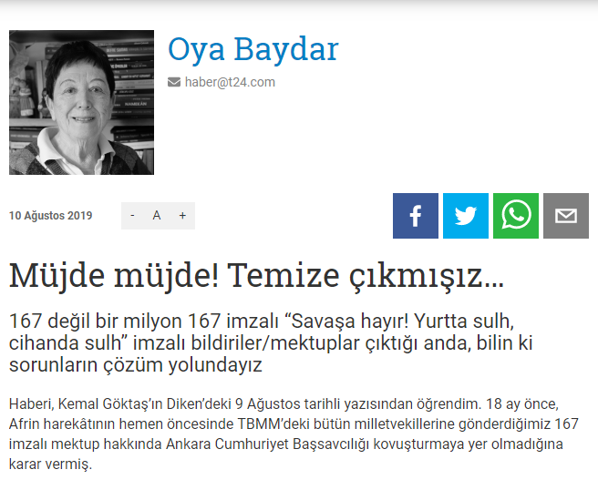 Terör örgütü PKK’nın ‘Made in Amerika’ imzalı kolu olan PYD’nin Fırat’ın Doğusu’nda oluşturduğu terör tehdidinin bertaraf edilmesi amacıyla planlanan askeri harekâtı engellemeye çalışanlar arasına katılan T24 yazarı Oya Baydar bugünkü yazısında, daha evvel Afrin operasyonunun ‘Kürtleri üzeceğini’ söyledikleri ve 167 imzayla meclise gönderdikleri mektubu ‘ifade özgürlüğü’ olarak değerlendiren Ankara Cumhuriyet Başsavcılığı kararını memnuniyetle karşıladığını yazdı. Baydar, mahkeme kararından aldığı destekle terör tehdidine karşı Fırat’ın Doğusu’nda başlatılması planlanan askeri harekâta karşı olduğunu dile getirerek, terör yanlısı tutumunu sürdürdü.