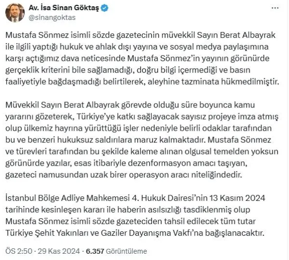 Eski Hazine ve Maliye Bakanı Berat Albayrak'ın avukatı İsa Sinan Göktaş, sözde gazeteci Mustafa Sönmez'in Berat Albayrak hakkındaki asılsız iddialarıyla ilgili açılan dava sonucunda tazminat ödemeye mahkum edildiğini açıkladı. Göktaş ayrıca Sönmez'e karşı kazanılan tazminat davasında tahsil edilecek tutarın, ‘Türkiye Şehit Yakınları ve Gaziler Dayanışma Vakfına’ bağışlanacağını kaydetti.