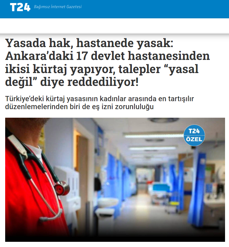 Köpeklerin çocukları katletmesini umursamayan T24, şimdi de kürtaj yaptıran kadınların bebekleri katletmesine destek çıktı!.. “Yasada hak, hastanede yasak: Ankara’daki 17 devlet hastanesinden ikisi kürtaj yapıyor, talepler ‘yasal değil’ diye reddediliyor!” başlıklı haberde, kürtaj cinayetine arka çıkıldı, kadınların eş rızası almadan kürtaj yaptırabilmesi savunuldu.