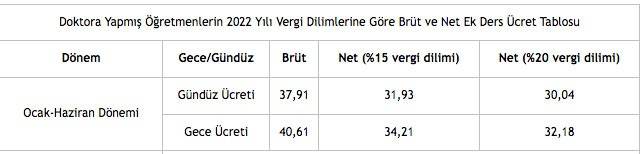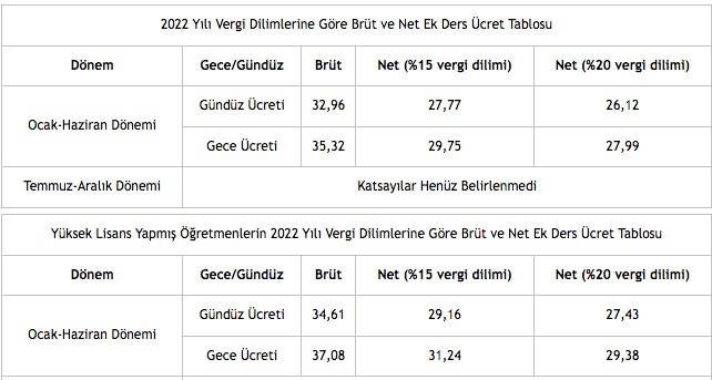 Gece net ek ders ücretleri %15 vergi dilimi için 29,06lira, %20 vergi dilimi için 27,34 ₺lira olmuştur.