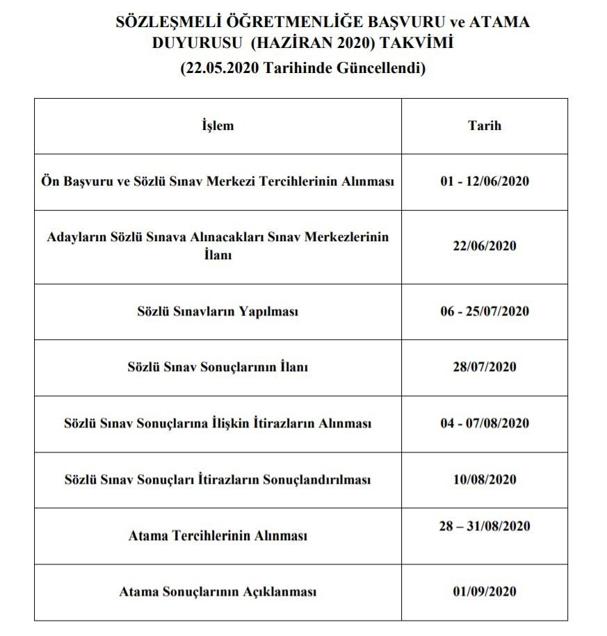 Sözleşmeli öğretmenlik başvurusunda bulunan adayların sözlü sınava alınacakları sınav merkezlerinin ilanı 22 Haziran 2020 tarihinde açıklanacak. Sözleşmeli öğretmenlik mülakatları 6 - 25 Temmuz 2020 tarihleri arasında yapılacak. Sonuçlar ise 28 Temmuz 2020 tarihinde erişime açılacak. Adayların sözlü sınava alınacakları sınav merkezleri 22 Haziran'da ilan edilecek. Sözlü sınavlar, 6-25 Temmuz'da yapılacak. Sözlü sınav sonuçları ise 28 Temmuz'da ilan edilecek. Bu kapsamda sonuçlara itirazlar, 4-7 Ağustos'ta alınacak. Bu itirazların sonuçları, 10 Ağustos'ta duyurulacak. Atama tercihleri, 28-31 Ağustos'ta alınacak, atama sonuçları ise 1 Eylül'de açıklanacak.