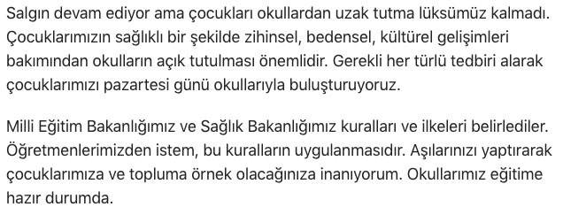 Cumhurbaşkanı Erdoğan'ın açıklamalarından satır başları şu şekilde: "Ataması yapılan öğretmenlerimizle birlikte okullarımızda görev yapan öğretmen sayımız 1 milyon 137 bini bulacaktır. Okullarımızın ve sınıflarımızın öğrenci mevcutlarını azalttık. Mevcudumuz 22 ile OECD ortalaması civarında. Öğretmen başına düşen öğrenci sayısı ilkokullarda 17, ortaokullarda 16, liselerde 12 civarında."