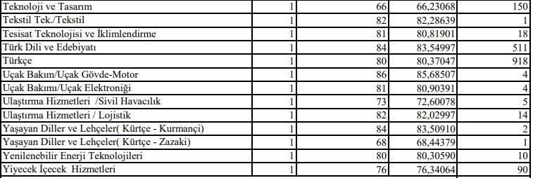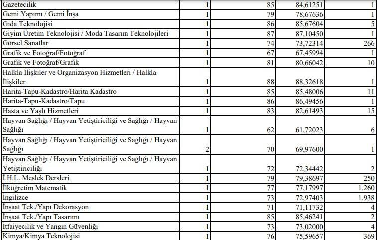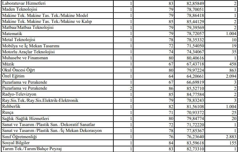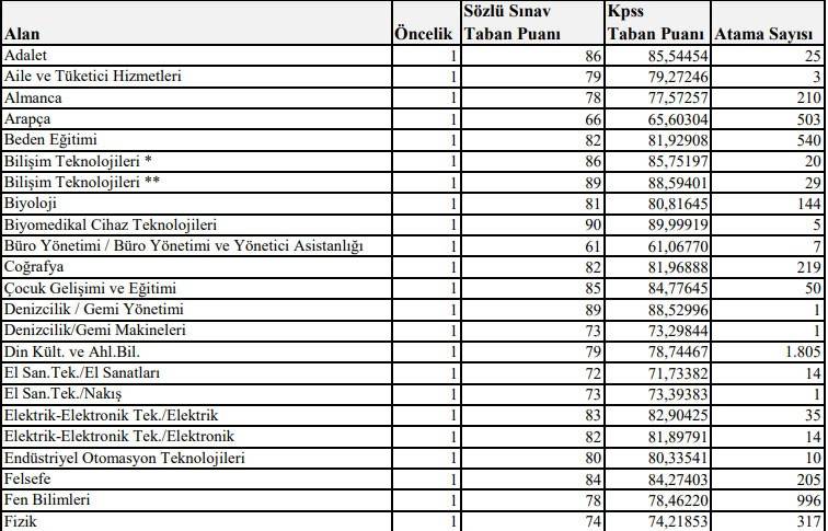 Sözleşmeli öğretmenlik ataması alan bazlı taban puanları