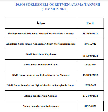 Sözleşmeli öğretmenlik mülakat yerleri 29 Temmuz’da açıklanacak. Sözlü sınavlar 1-13 Ağustos tarihleri arasında gerçekleştirilecek, sonuçları ise 16 Ağustos 2022'de açıklanacak. Sözlü sınavlar 1-13 Ağustos tarihleri arasında gerçekleştirilecek, sonuçları ise 16 Ağustos 2022'de açıklanacak. 17-18 Ağustos 2022 tarihleri arasında sözlü sınav sonuçlarına itirazlar alınacak ve bu itirazlar, 22 Ağustos sonuçlandırılacak. Atama tercihleri 27-31 Ağustos tarihleri arasında alınacak.