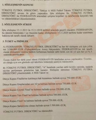 - "İşbu sözleşme federasyon tarafından tek taraflı olarak feshedildiği takdirde, Türkiye futbol direktörünün fesih tarihine kadar hak edilmiş ücret ve sair haklarının yanı sıra, sözleşmenin geri kalan süresine (15.11.2018) ilişkin hak edilecek sabit ücret toplamı, ait olduğu ayın son gününde ve eşit taksitlerde, erken fesih tazminatı olarak Türkiye futbol direktörüne ödenir."