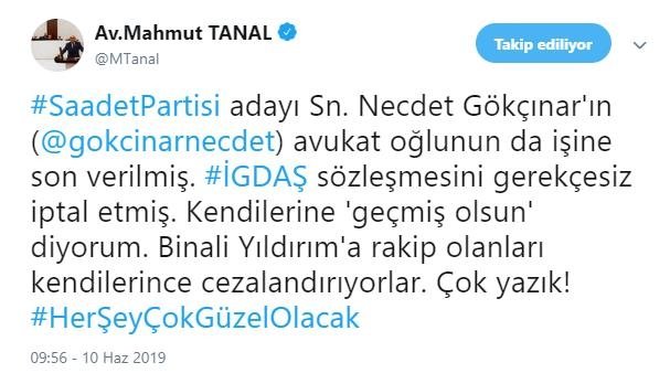 İGDAŞ’tan yapılan yazılı açıklamada, “Söz konusu paylaşımda iddia edildiği gibi Saadet Partisinin İstanbul Büyükşehir Belediye Başkan Adayı Necdet Gökçınar’ın oğlunun İGDAŞ’tan çıkarılması söz konusu değildir. Çünkü hiçbir zaman sayın Gökçınar’ın oğlu İGDAŞ’ta personel olarak çalışmamıştır. Dolayısıyla işine son verilmesi gibi bir durum söz konusu değildir. Saadet Partisinin adayı sayın Necdet Gökçınar’ın oğlu R.E. Gökçınar 17 Nisan 2006 yılında İBB’de sözleşmeli memur olarak işe başlamış, 3 Mart 2009’da memur olmuş; 15 Mayıs 2012 tarihinden bu yana ise İBB Tesisler Bakım onarım Müdürlüğünde (657’ye tabi memur) halen mühendis olarak çalışmaya devam etmektedir. Bununla beraber; Saadet Partisi İBB Başkan Adayı Necdet Gökçınar’ın avukat olan eşinin, İGDAŞ ile Avukatlık Hizmet Sözleşmesi vardır ve halen devam etmektedir. Şirketlerimizin sözleşmeli tüm avukatlarının bulunduğu sistemde rutin olarak yapılan iyileştirme çalışması nedeniyle takip dosyalarına geçici olarak sistem üzerinden erişilememektedir. Bu sistem iyileştirme çalışması şirketimizin tüm avukatları için geçerli olup, adayın eşine yapılan özel bir işlem değildir. Çalışmalar sonuçlanır sonuçlanmaz sistem erişime açılacaktır” denildi.