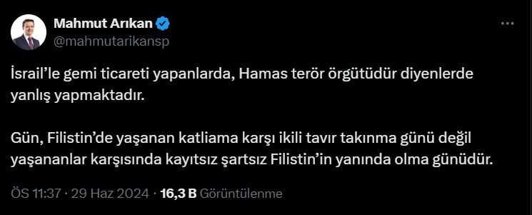 Arıkan sosyal medya hesabından yaptığı açıklamada, "İsrail’le gemi ticareti yapanlarda, Hamas terör örgütüdür diyenlerde yanlış yapmaktadır. Gün, Filistin’de yaşanan katliama karşı ikili tavır takınma günü değil yaşananlar karşısında kayıtsız şartsız Filistin’in yanında olma günüdür." ifadelerini kullandı.