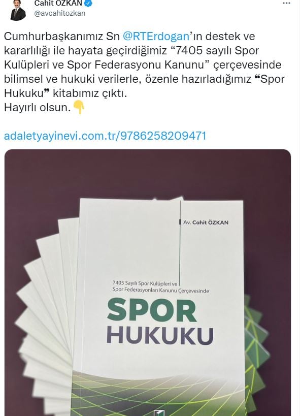 AK Parti Denizli Milletvekili Cahit Özkan’ın sosyal medya hesabı üzerinden “Spor Hukuku” kitabının çıktığını duyurdu.
