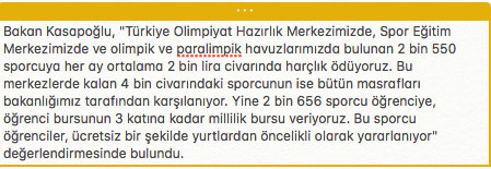Cumhurbaşkanı Erdoğan, Ankara’da 'Milli Sporcu Bursu Tanıtım Toplantısı'nda açıklamalarda bulundu. Cumhurbaşkanı Erdoğan spor bölümlerinde okuyan öğrencilere burs müjdesini vererek şunları söyledi: “Spordaki başarılarımızı artırmak için hayata geçirdiğimiz en önemli projelerden biri sporcu eğitim merkezidir. Toplam 1671 sporcu yetiştiriyoruz. Sporcularımıza hem faaliyet gösterdikleri spor dalı hem dersleri için özel eğitimler veriyoruz. Her başarı önemlidir. Ancak başarının kendisi kadar, başarının emeğin, kalitenin takdir edilmesi de önemlidir. Başarılı sporcularımızın emeklerini zayi etmemek için farklı destek programlarını devreye aldık. Sporcularımızın uluslararası aladaki başarılı arttıkça ailelerin çocuklarını spora yönlendirme şevki artıyor. Gençlik geleceğin tohumu, istikbalimizin teminatıdır. Hepimizin görevi gençlerimize hayallerini gerçekleştirecekleri bir ortam sağlamaktır. Sporcu bursu ile belirli başarı kriterlerini sağlayan genç sporcularımız, kazandıkları bölümlerde yüzde 100 burslu şekilde okuyabilecekler.”