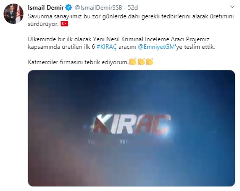 Bu süreçte Emniyet Genel Müdürlüğü teşkilatına da yeni kabiliyetler kazandırmaya devam ettiklerini vurgulayan Demir, "Ülkemizde bir ilk olacak Yeni Nesil Kriminal İnceleme Aracı Projemiz kapsamında üretilen ilk 6 'Kıraç'ı Emniyet Genel Müdürlüğümüze teslim ettik. Katmerciler firmasını tebrik ediyorum." dedi.