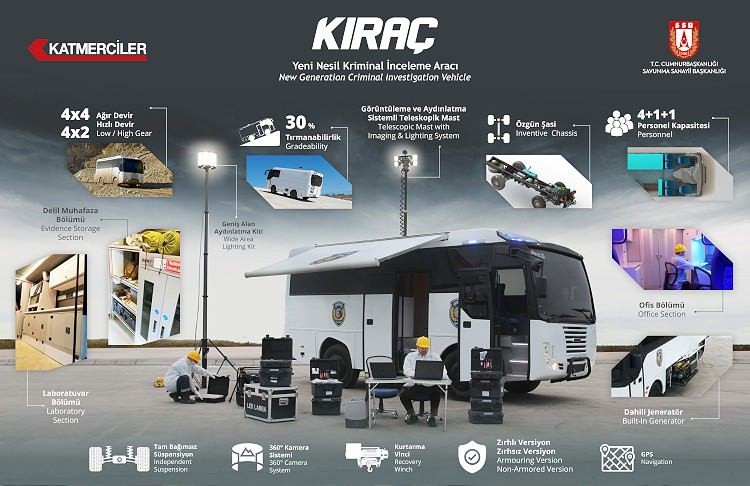 EGM’nin olay yerinde daha etkili inceleme yapması, delilleri emniyetli ve hızlı toplaması için başlatılan Yeni Nesil Kriminal İnceleme Aracı projesi kapsamında 60 KIRAÇ aracı, 385 panelvan tipi Olay Yeri İnceleme Aracı ve görev ekipmanları Katmerciler tarafından üretilecek.