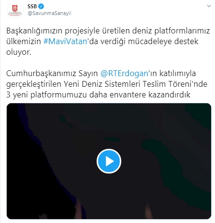 SSB'nin Twitter hesabından yapılan paylaşımda "Başkanlığımızın projesiyle üretilen deniz platformlarımız ülkemizin Mavi Vatan'da verdiği mücadeleye destek oluyor. Cumhurbaşkanımız Sayın Recep Tayyip Erdoğan'ın katılımıyla gerçekleştirilen Yeni Deniz Sistemleri Teslim Töreni'nde 3 yeni platformumuzu daha envantere kazandırdık" ifadelerine yer verildi.