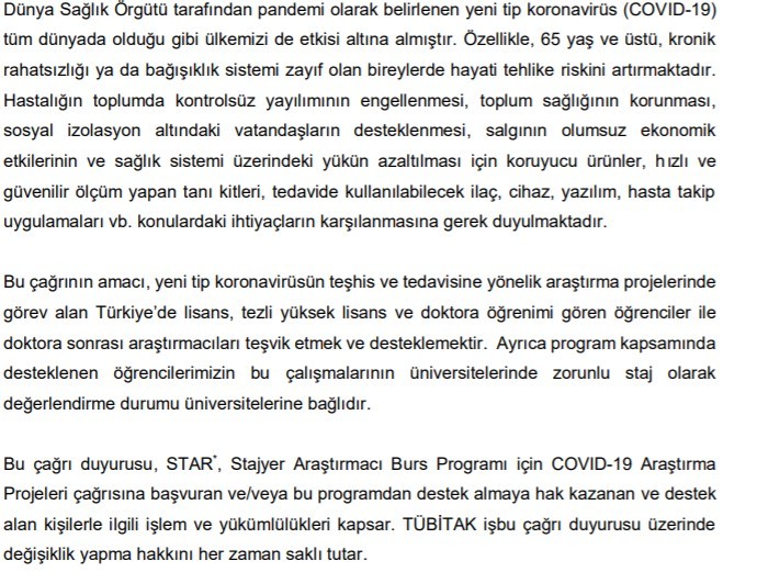 TÜBİTAK, Tüm Dünyada ve Ülkemizde pandemi olarak belirlenen Covid-19 için ülkemizde yapılan çalışmalarda görev alan Lisans, Yüksek lisans, Doktora öğrencileri ve Doktora Sonrası Araştırmacılar için burs desteği sağlayacaktır.