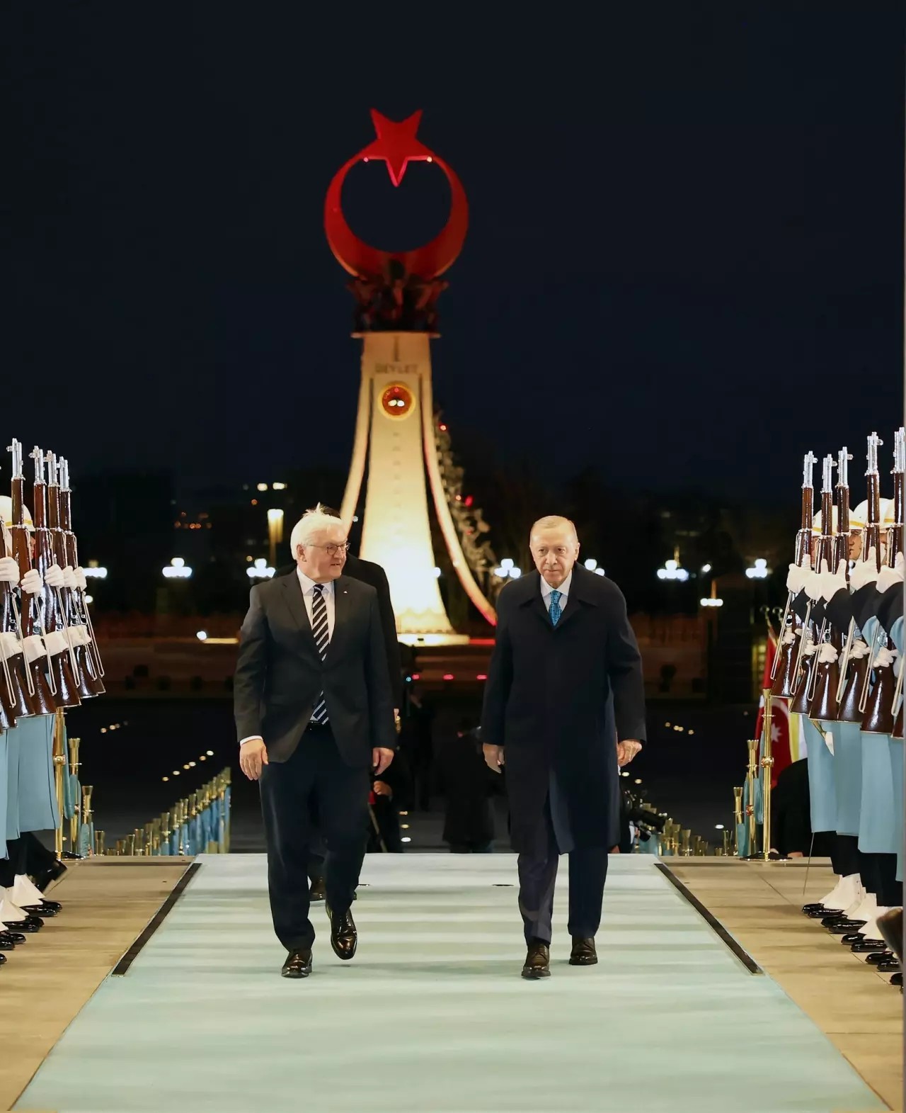 Cumhurbaşkanı Erdoğan, Steinmeier'i, Cumhurbaşkanlığı Külliyesi'nin giriş kapısında karşıladı. Erdoğan ve Steinmeier, merdivenlerde Türkiye ve Almanya bayrakları önünde fotoğraf çektirdi.
