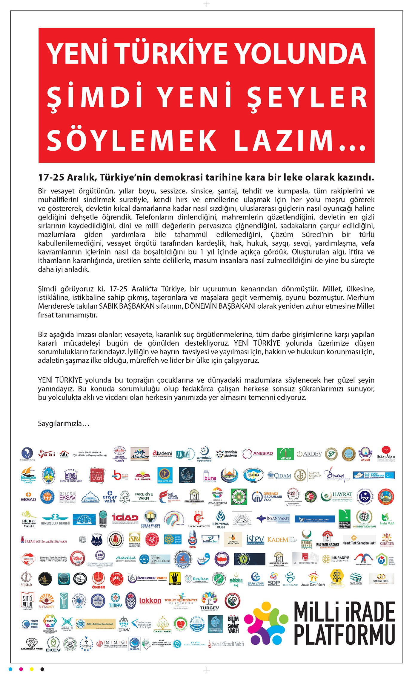 Aralarında Hak-İş, MÜSİAD, Memur-Sen, İHH İnsani Yardım Vakfı, Kadın ve Demokrasi Derneği, Milli Türk Talebe Birliği, Muradiye Kültür Vakfı, ÖNDER, Rabia Platformu, TÜRGEV, Bilim ve Sanat Vakfı'nın yer aldığı değişik alanlarda faaliyet gösteren 150 dolayında sivil toplum kuruluşu ve cemaat, gazetelere, "Milli İrade Platformu" imzası ve "Yeni Türkiye Yolunda Şimdi Yeni Şeyler Söylemek Lazım..." başlıklı ile ilan verdi.
