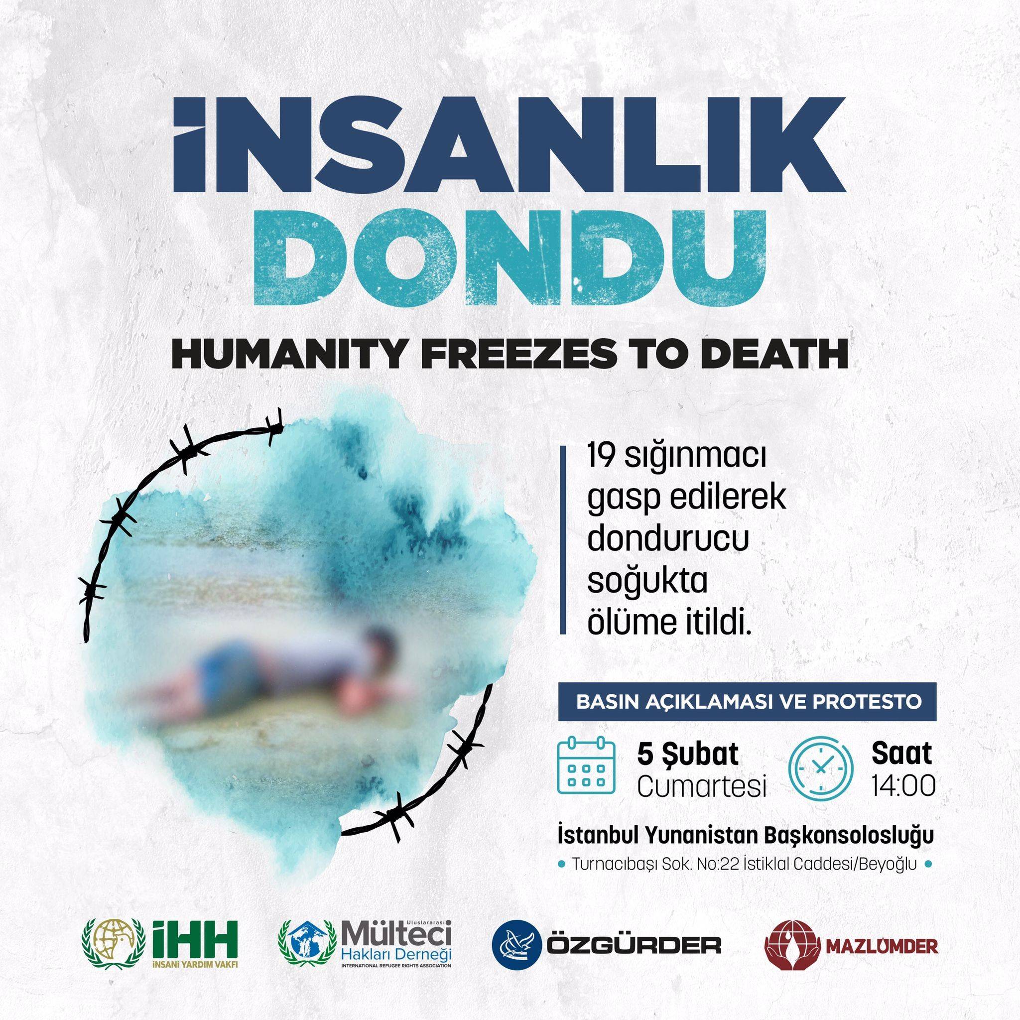 “İnsanlık Dondu!” sloganıyla düzenlenecek basın açıklaması, 5 Şubat Cumartesi günü Yunanistan’ın İstanbul Taksim’deki Başkonsolosluğu önünde düzenlenecek.