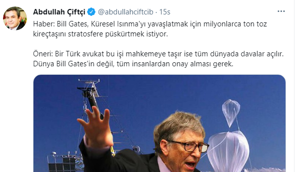 Bill Gates’in Küresel Isınma'yı yavaşlatmak için milyonlarca ton toz kireçtaşını stratosfere püskürtmek istediği proje yine gündem oldu. Stratejist Abdullah Çiftçi, sosyal medya hesabından çarpıcı bir paylaşıma imza atarak Türk avukatların yapması muhtemel olan planını açıkladı.