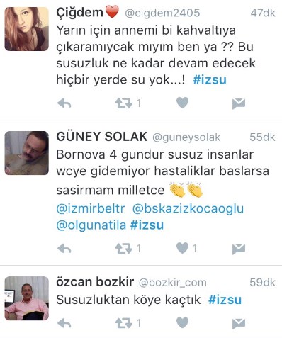 Bornova'nın 35 mahallesine 4 gündür, Bayraklı ilçesi Fatih Caddesi üzerinde bulunan 2200 milimetre çaplı isale hattı üzerinde boru arızası nedeniyle su verilemiyor. Arızanın giderilmesi için çalışmalar devam ederken su kesintileri de vatandaşları isyan ettirdi. Vatandaşlar camilerin depolarında bulunan sulardan evdeki ihtiyaçlarını görmek için bidonlarla su çekerken İZSU ise ilçelerden çektiği tankerlerle mahalle aralarında dolaşarak vatandaşların su ihtiyaçlarını gidermeye çalışıyor.