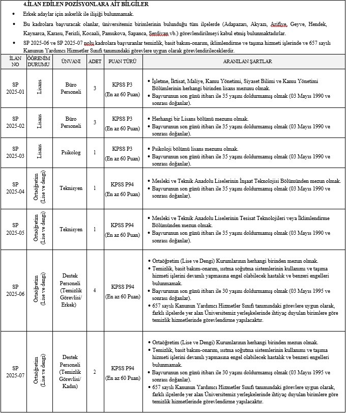 Sakarya Uygulamalı Bilimler Üniversitesi (SUBÜ), 2024 yılı Kamu Personeli Seçme Sınavı (KPSS) ile sözleşmeli personel alımı için ilana çıktı. Resmi Gazete’de yayımlanan ilanla, 6 lisans mezunu büro personeli, lisans mezunu psikolog, 2 lise ve dengi mezunu teknisyen, 4 lise ve dengi mezunu erkek destek personeli, 2 lise ve dengi mezunu kadın destek personeli olmak üzere toplam 15 personel alınacak. İlanlara başvurular 18 Nisan Cuma günü başlayacak ve 2 Mayıs Cuma günü mesai bitiminde sona erecek.