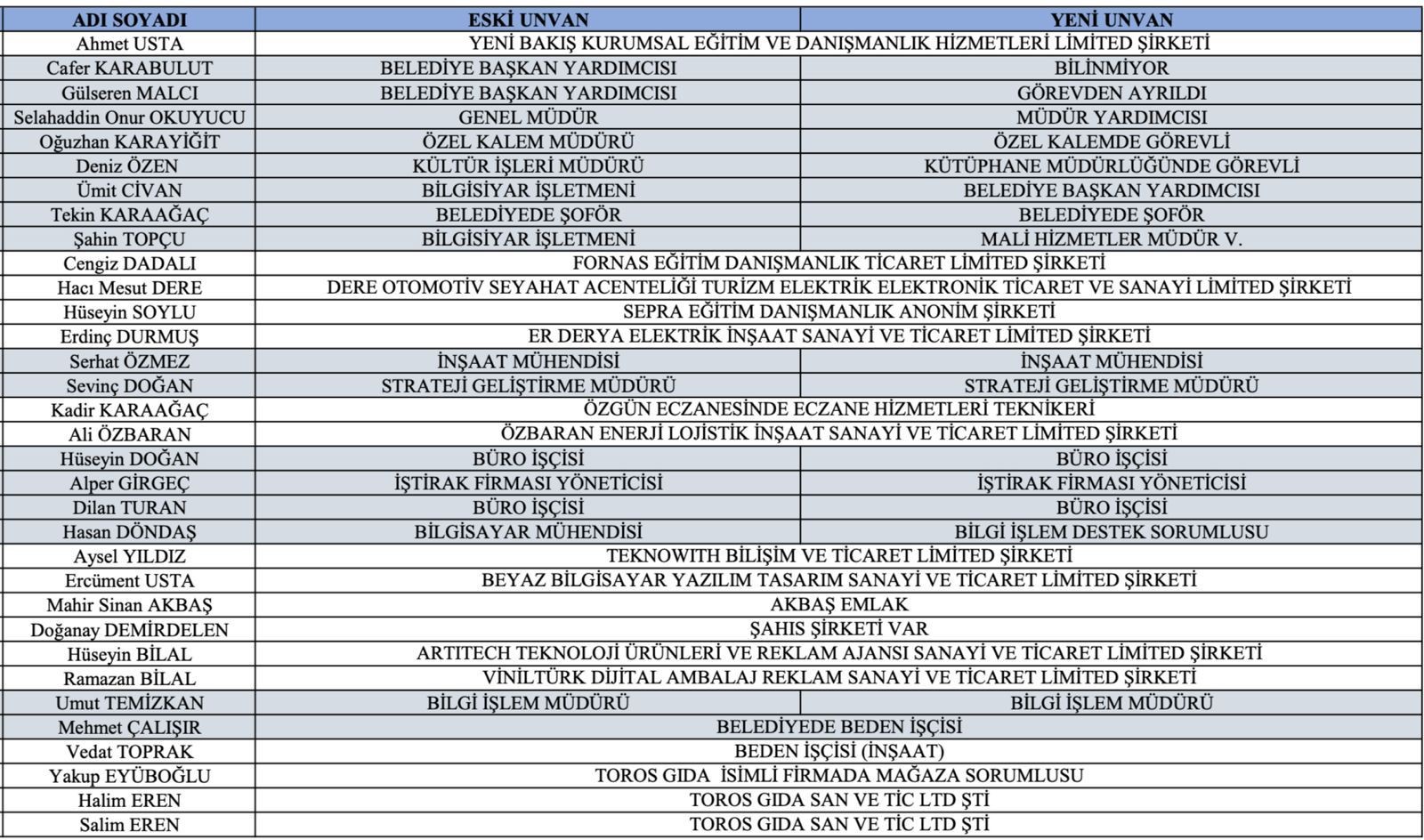 Soruşturma kapsamında olay tarihinde görev yapan iki belediye başkan yardımcısı ile halen görevde bulunan bir başkan yardımcısının da aralarında bulunduğu üst düzey isimler dosyada yer aldı. Bunun yanında geçmişte genel müdürlük yapmış ve şu anda müdür yardımcısı olarak görevine devam eden bir isim, belediyenin çeşitli birimlerinde çalışan memur ve işçiler ile özel sektörde faaliyet gösteren çok sayıda yönetici ve temsilci de şüpheliler arasında bulunuyor. Ayrıca daha önce KHK ile ihraç edilmiş ve belediye ihalelerinde etkin rol oynadığı öne sürülen bir kişinin de bu yapı içinde yer aldığı değerlendiriliyor.