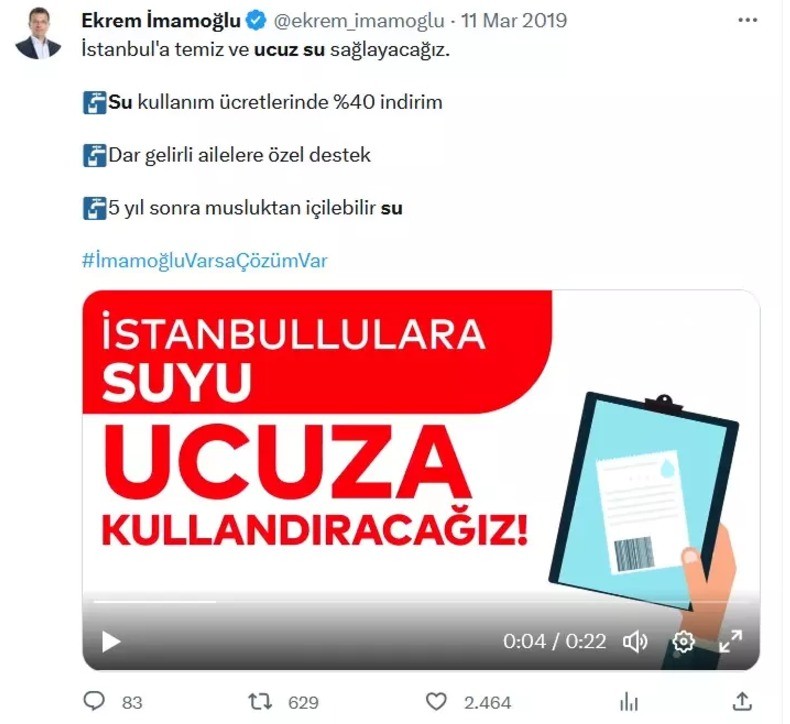 Ekrem İmamoğlu, seçim kampanyası sırasında suyun temel bir ihtiyaç olduğunu vurgulayarak, “Sudan para kazanılmaz, ucuzlatacağız” demişti. Ancak seçim sonrası bu söylemin tam tersi bir politika izlenerek su fiyatlarına ardı ardına zam yapıldı. Vatandaşlar, bu durumun vaatlerin aksine ekonomik yükü artırdığını belirterek İmamoğlu yönetimindeki CHP belediyeciliğini eleştirdi.