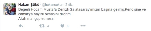 Mustafa Denizli'ye ilk tebrik mesajı geçmiş yıllarda birlikte çalıştığı Hakan Şükür'den geldi. Şükür, resmi Twitter hesabından "Değerli hocam Mustafa Denizli Galatasarayımız'ın başına gelmiş. Kendisine ve camiaya hayırlı olmasını dilerim. Allah mahcup etmesin" şeklinde tweet attı.