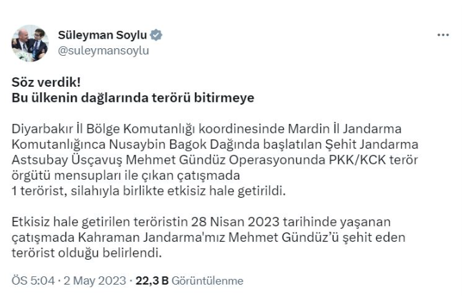 İçişleri Bakanı Süleyman Soylu, Twitter hesabından yaptığı açıklamada, "Söz verdik! Bu ülkenin dağlarında terörü bitirmeye... Diyarbakır İl Bölge Komutanlığı koordinesinde Mardin İl Jandarma Komutanlığı’nca Nusaybin Bagok Dağı’nda başlatılan Şehit Jandarma Astsubay Üstçavuş Mehmet Gündüz Operasyonunda PKK/KCK terör örgütü mensupları ile çıkan çatışmada 1 terörist, silahıyla birlikte etkisiz hale getirildi. Etkisiz hale getirilen teröristin 28 Nisan 2023 tarihinde yaşanan çatışmada kahraman jandarmamız Mehmet Gündüz’ü şehit eden terörist olduğu belirlendi" dedi.