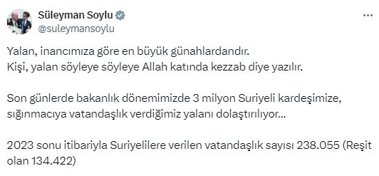 Sosyal medya hesabından açıklama yapan Süleyman Soylu, ''Yalan, inancımıza göre en büyük günahlardandır. Kişi, yalan söyleye söyleye Allah katında kezzab diye yazılır. Son günlerde bakanlık dönemimizde 3 milyon Suriyeli kardeşimize, sığınmacıya vatandaşlık verdiğimiz yalanı dolaştırılıyor… 2023 sonu itibariyla Suriyelilere verilen vatandaşlık sayısı 238.055 (Reşit olan 134.422)'' ifadelerini kullandı.